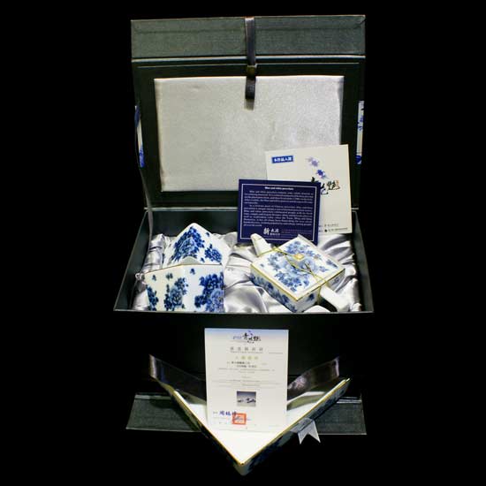 Showcased is a porcelain tea set that has been treated under 1,200 degrees Celsius in the kiln. The set comes with elegant flowery patterns that are blue in color. The set contains cobalt minerals.