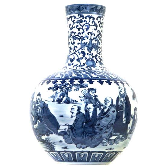 This is a celestial-sphere shaped vase with under glaze blue decoration of figures. It is made of porcelain. It looks perfect even without flower arrangement.