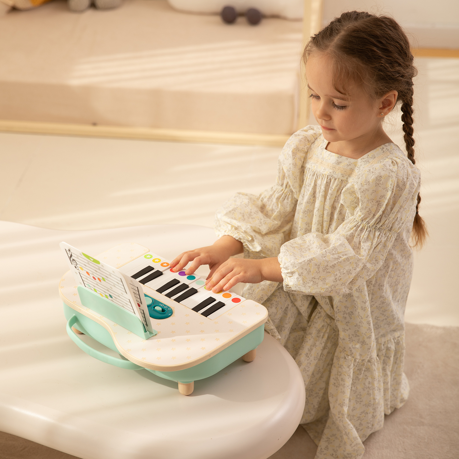 The portable electronic piano is an engaging musical instrument designed for little musicians aged 3+. It features an easy-to-understand music score, enabling children to learn and play tunes effortlessly. Its compact size makes it ideal for travel and storage, allowing for musical exploration anywhere. The piano is adorable and colorful, capturing attention and sparking creativity. This toy not only promotes musical development but also provides a fun and accessible way for children to express themselves musically.