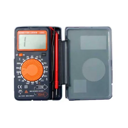 Displayed here is a portable multimeter with a digital display. It comes with a matching case for easy storage. It outperforms the rest with high stability.