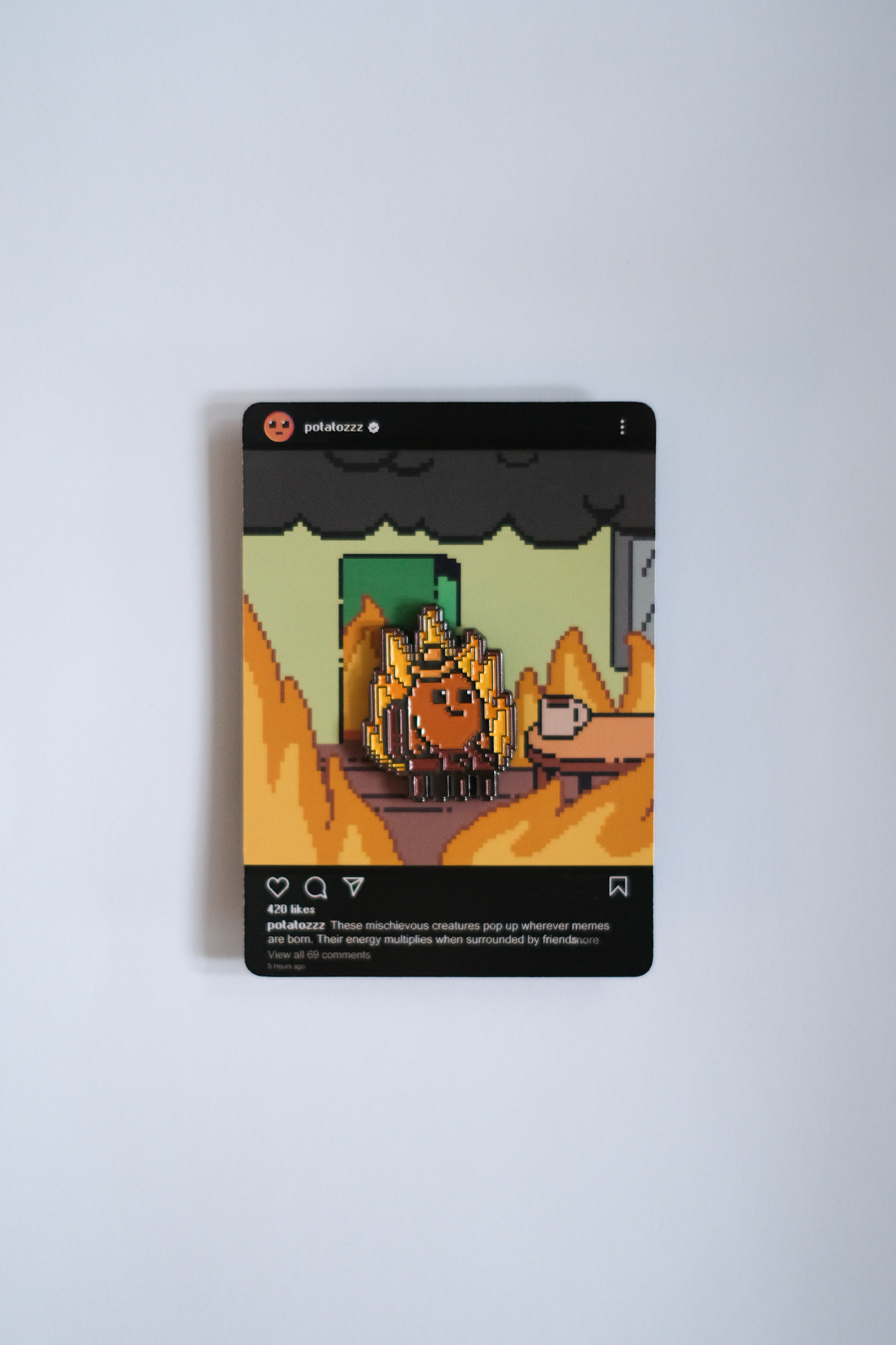 Introducing the Potatoz Meme Pins Collection, where your beloved Potatoz squad gets mashed together with the most iconic memes from across the web. Each pin features Potatoz reimagined as legendary meme icons, turning every expression and punchline into collectible, wearable art. Clip them on your bag, jacket, or display board - because life's too short not to meme like a Potatoz. 💛
