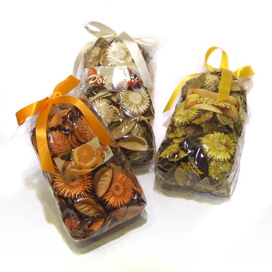 The featuring items are three bags of potpourri for home and interior decorations. They are available in different scents such as orange and lemon, giving the surrounding pleasent aroma.