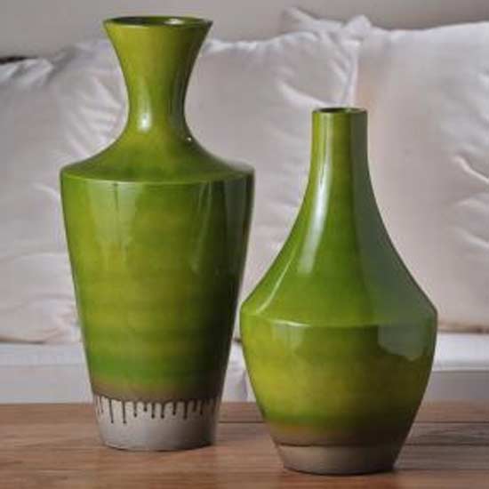 The pottery vases boast uniquely appealing handmade shapes. They are painted in graceful green that gives a crisp and fresh look. The bottoms are non-painted for added specialty.
