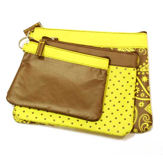 Displayed here is a three-piece pouch set. It includes pouches with different sizes and in different styles. One is plain while the other two come with patterns. The pouches can be used to hold coins, keys, credit cards, etc.