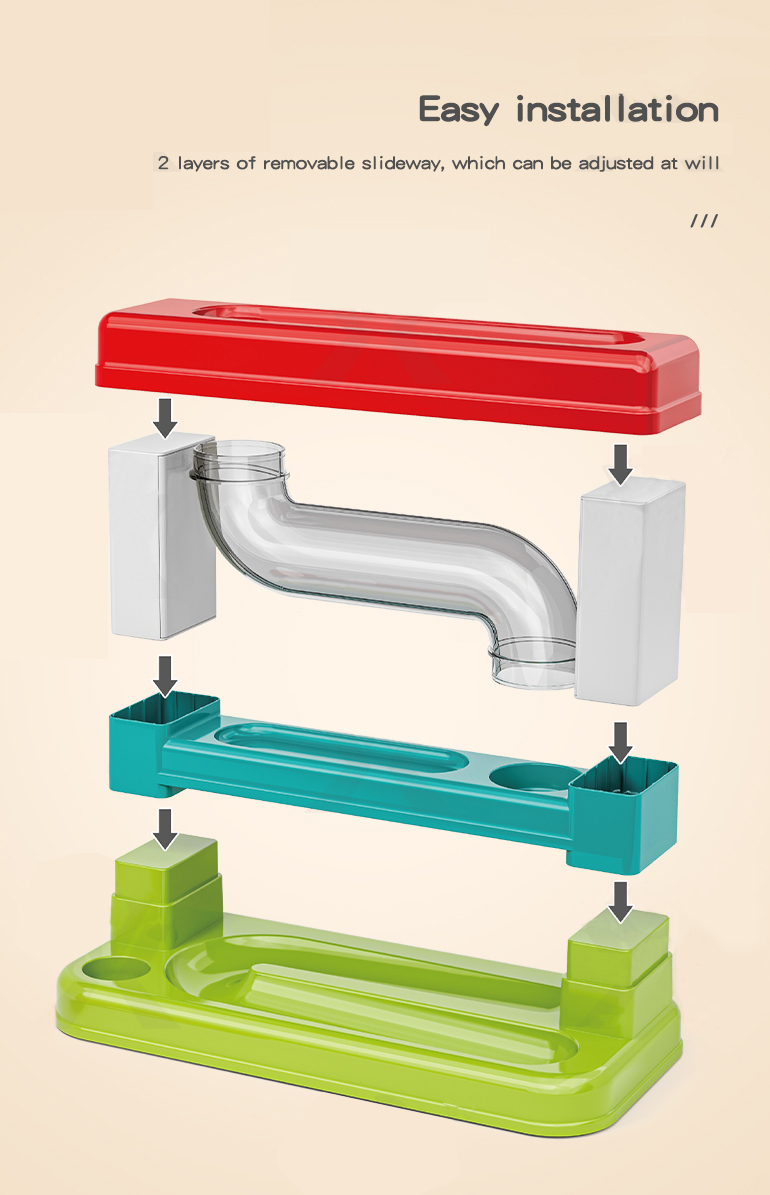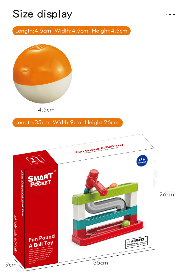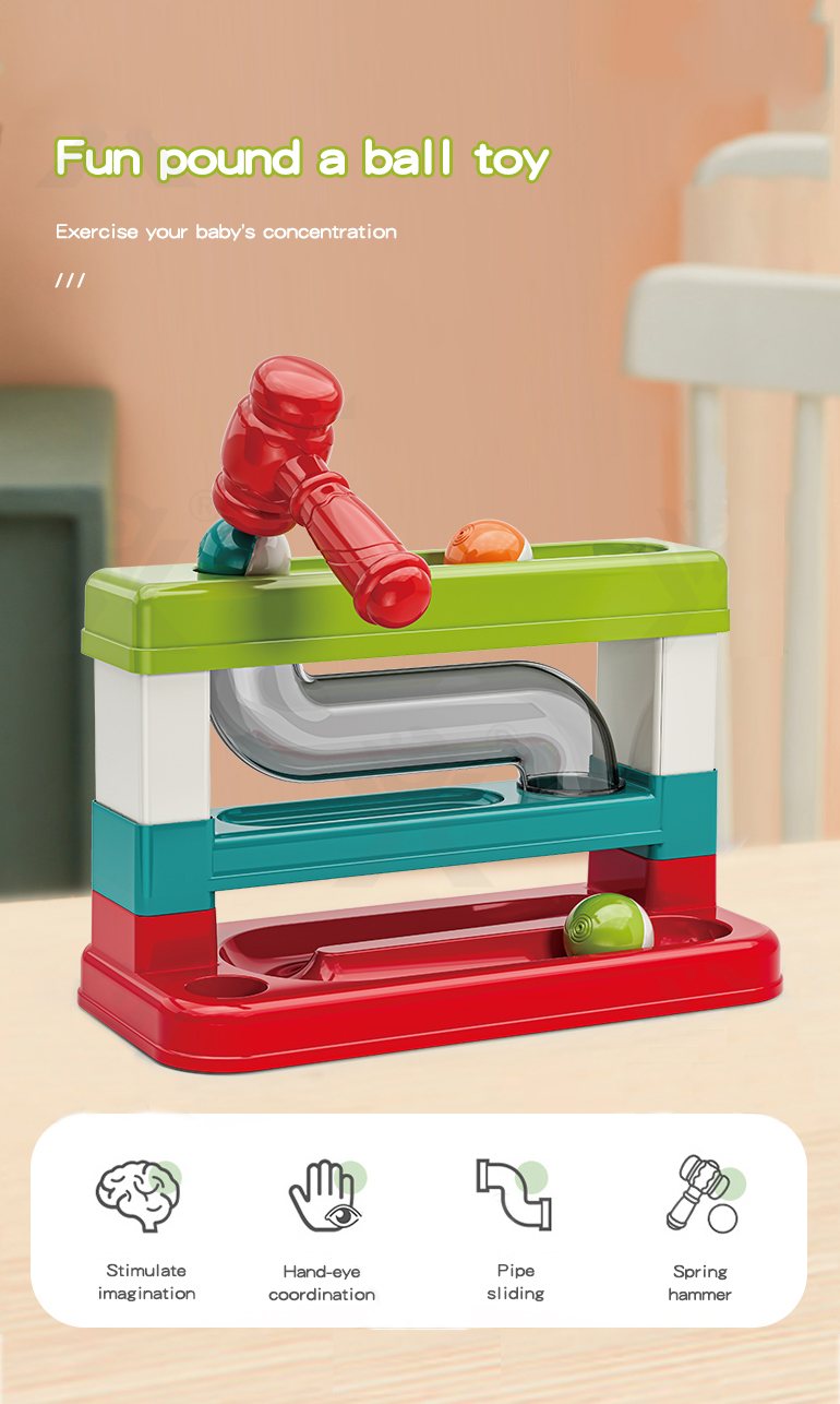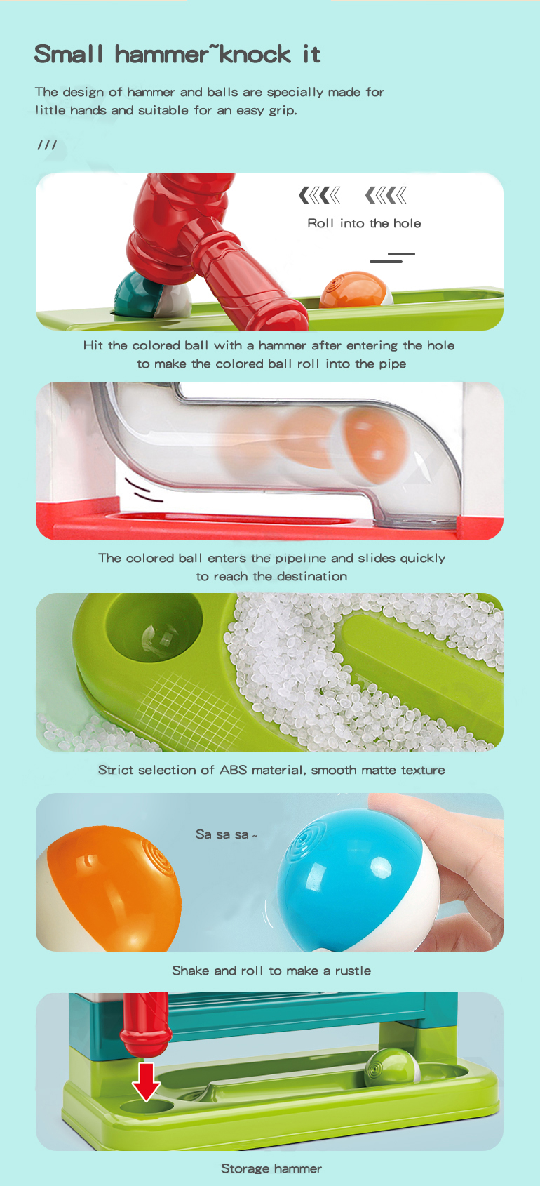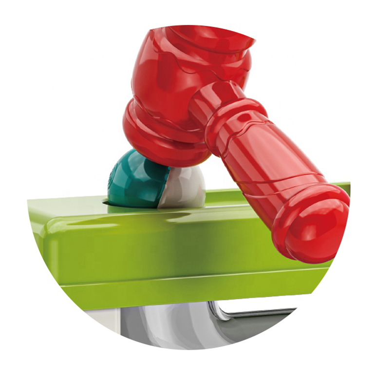 【Feature】: Hammering practice, pound the balls through the holes, can see the balls drop down and roll down the chute out on the bottom tray.