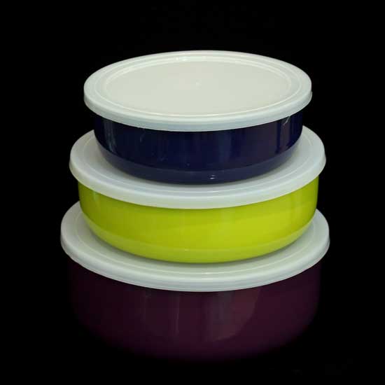 Featured is a series of bowls in different colors and sizes. The bowl is completed in power coated finish with a lid. The bright color is sure to enhance the appearance of the bowl.
