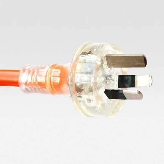 This is a power cord with a clear head and three metal pins. It features an orange jacket which is made of robust material. Designed professionally, this power cord is suitable for assorted electrical products.