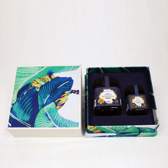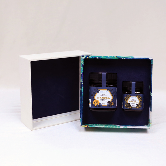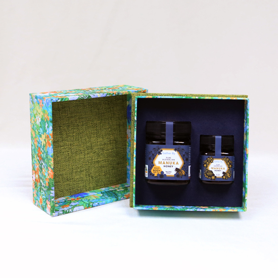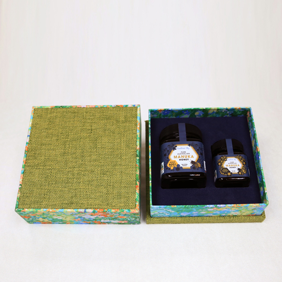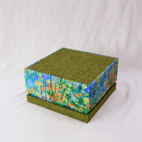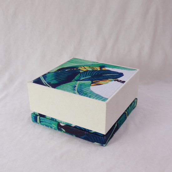 Fashionable fabric covered plastic premium gift boxes. Dimension 160 x 160 x 86 mm.