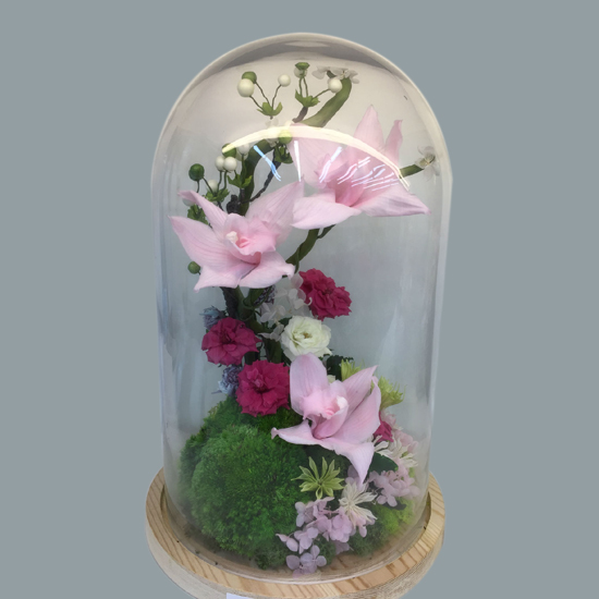 Add a radiant brush of pink to your living spaces using this preserved floral decoration. Apart from its 3 gorgeous main blooms, this delicate piece is complemented with clusters of soft-colored buds and plants here and there. Including a wooden base and transparent cover, this one is ideal for decorating your tabletops.