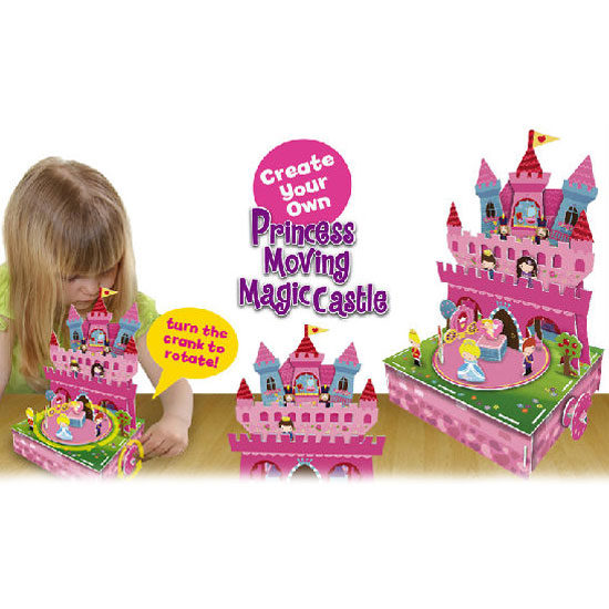 This princess moving magic castle comes with a pink finish. With an easy assembly kit with pre-cut foam board components, this magic castle lets your children assemble the stage and castle by themselves. Children can install the crank and gears underneath the stage so that they can turn the crank and make the disc rotate.