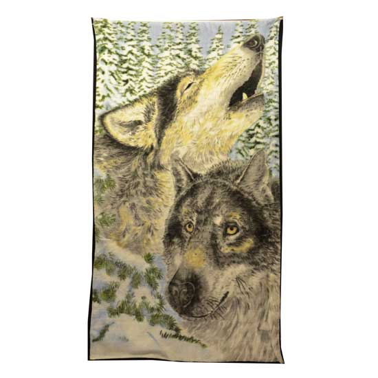 As shown here is a blanket with a wolf-print design. It is well made of high-quality material for added comfort and softness. This wolf-print blanket is great for home use.