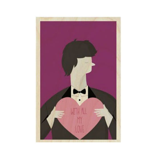 This dainty card boasts a romantic design. It is printed with a gentleman holding a pink heart on the front. The heart comes with an English sentence “With all my love”.