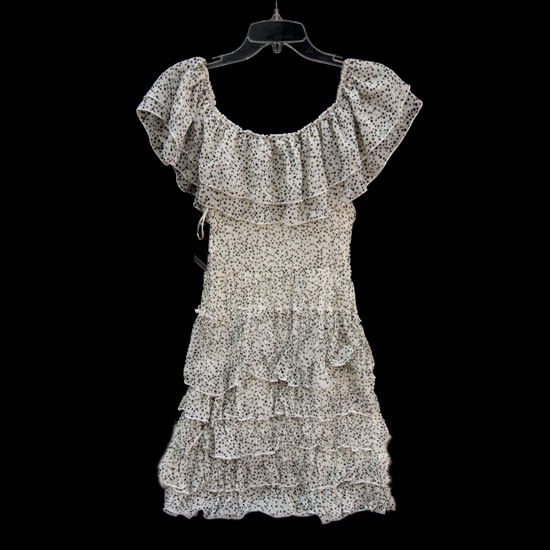 The printed dress is fully made of strong and durable polyester. It features dainty dots throughout for a splash of style. The wide, presentable scoop neck is prettified with nice-looking ruffles.