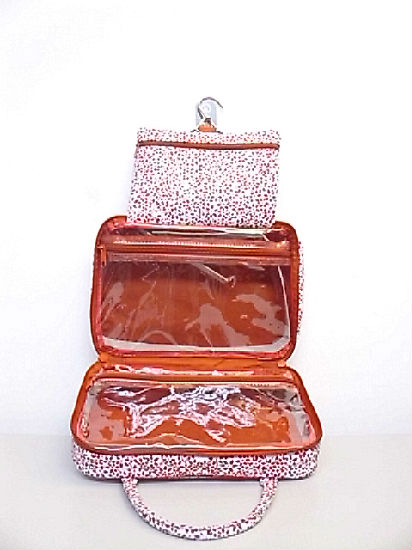 Inside have one metal hook hanger, one zipper pocket and two zipper compartment. The zipper pocket make with self-material, the zipper compartment make with clear PVC.