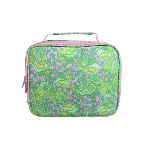 This is a printed lunch bag that comes with a zippered closure. It is fitted with a top handle for easy and convenient carrying. This lunch bag offers long-lasting durability.