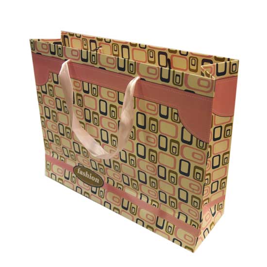 This printed paper bag features geometric patterns in assorted colors. Pink detail lends a touch of sweetness to the overall design. Other designs are also available as per your requests.