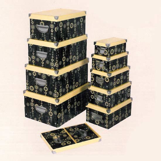 Available in 9 different sizes, these deluxe printed paper boxes take care of all your storage and gift-giving needs. They feature a classic rectangular shape, two convenient carrying handles, all-over circular patterns, and a cover in a contrasting color. They are handmade for enhanced quality.