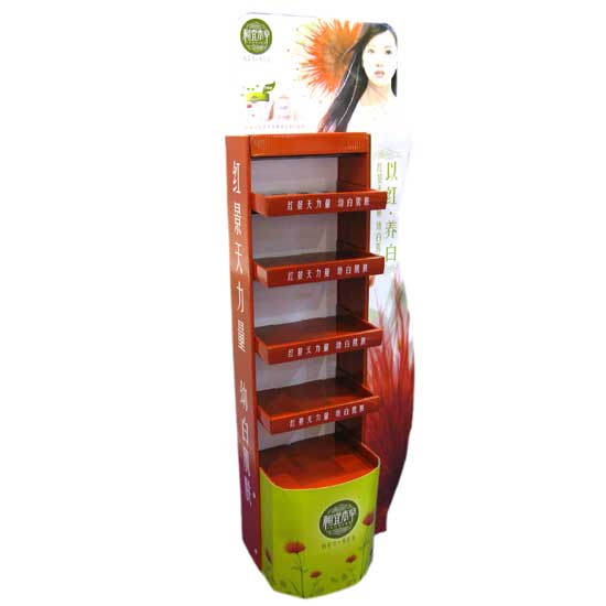 The floor-standing product display unit features multiple tiers for displaying various kinds of products. The foldable design offers efficient use of space. This product display unit is quick to assemble.