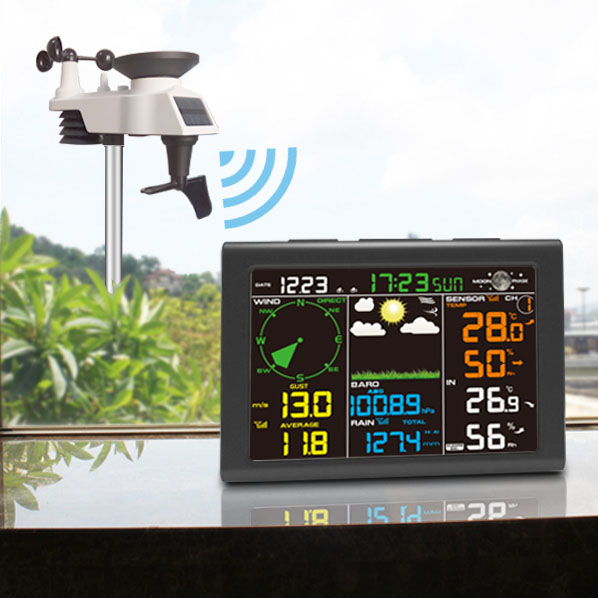 Professional wifi weather station featuring indoor/outdoor temperature humidity, wind, rain, UV, Light, weather forecast. With wifi connection optional to upload data to www.wunderground.com or www.weathercloud.net. Clear and colorful display.