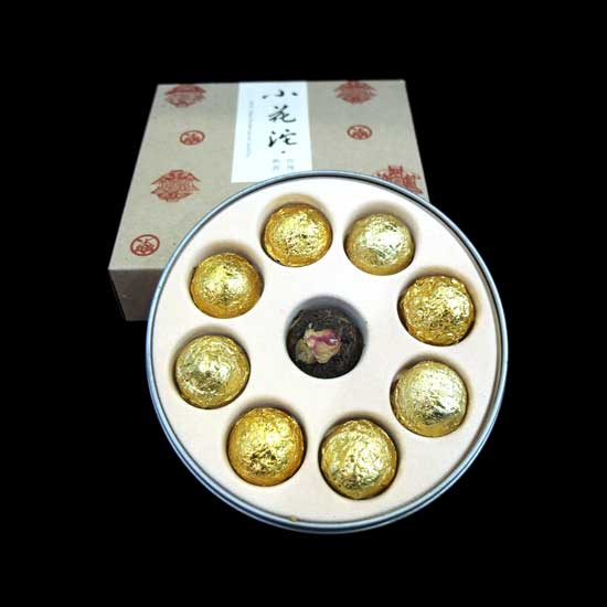 This pu-erh tea features egg-shaped packaging in an eye-catching golden color. It reveals irresistible rose fragrances and presents a brownish tea soup. This delicately packaged pu-erh tea is a wonderful gift choice.