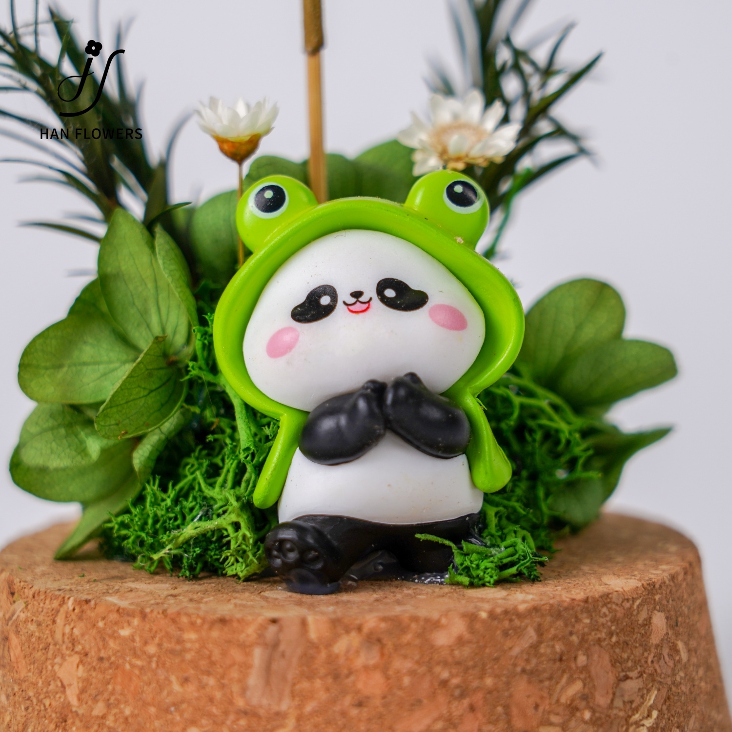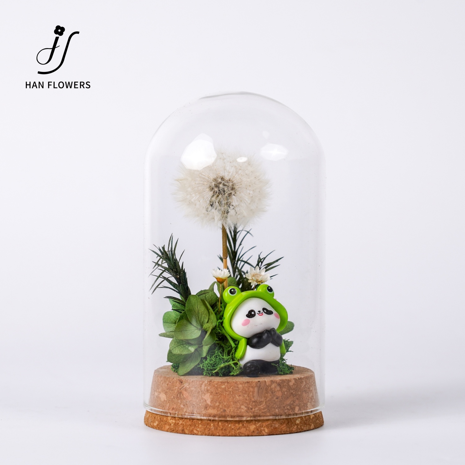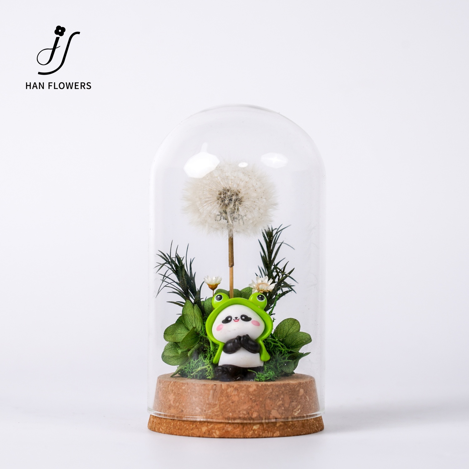 Meet the softest guardian of wishes: our panda in a froggy hood, hands clasped in sweet anticipation, beside an eternally preserved dandelion puff.