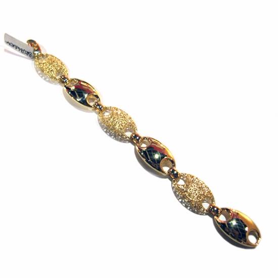 This is a puffed mariner chain. The chain is composed of interlacing mirror polished and sandblasted gold pieces. The mariner chain pieces are connected by small gold loops.