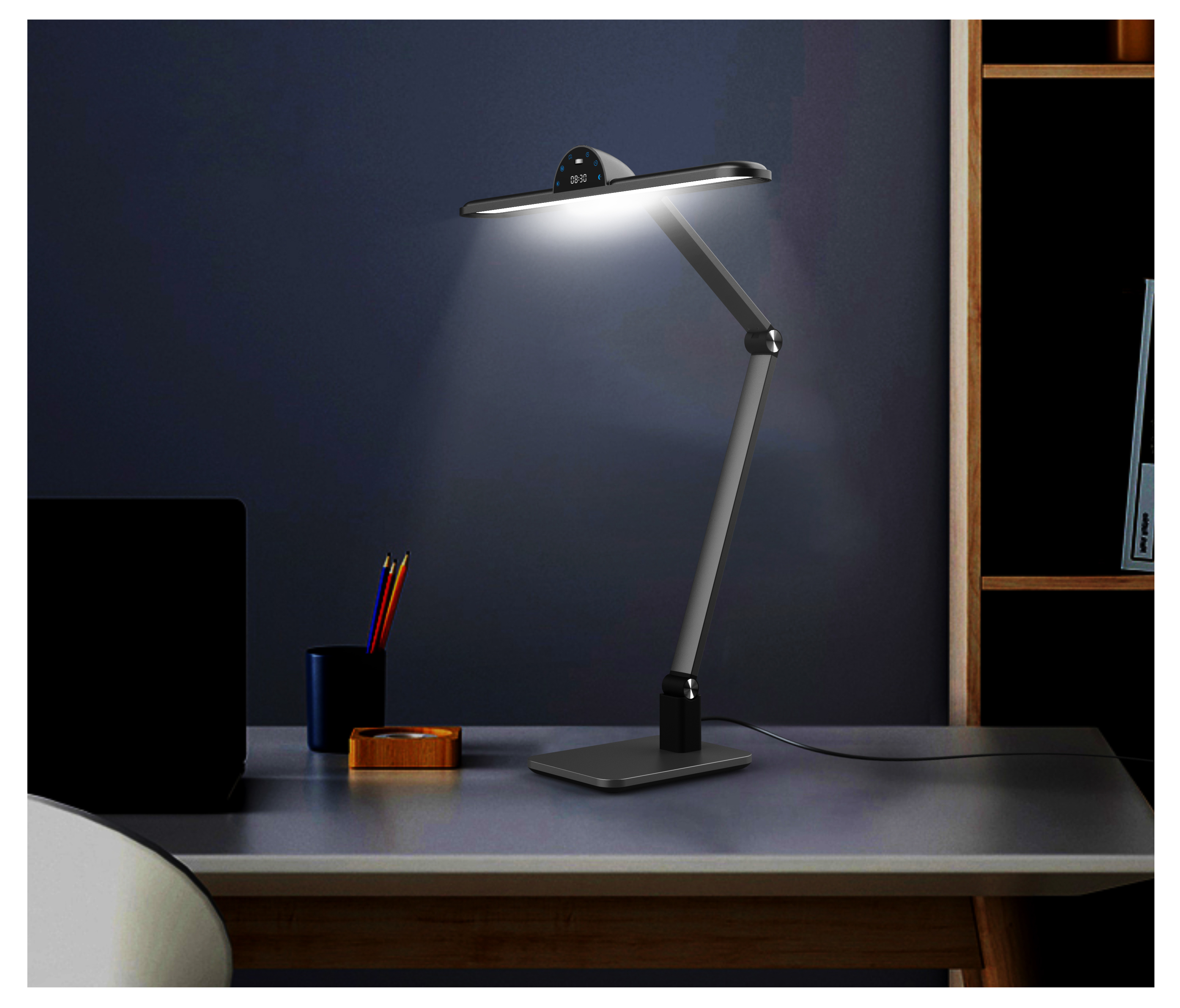 The color of this desk lamp is sky grey. it is simple and fashion. The light head is wide and the lightbase is heavy. You can adjust the table lamp and provide more light for your need.