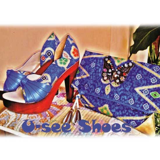 This pump shoes and clutch bag set boasts an eye-catching, colorful design with patterned fabrics. The pump sandals feature a red platform and a red heel for a contrasting effect. The zip clutch bag is designed with a butterfly accent for a feminine, tropical look.
