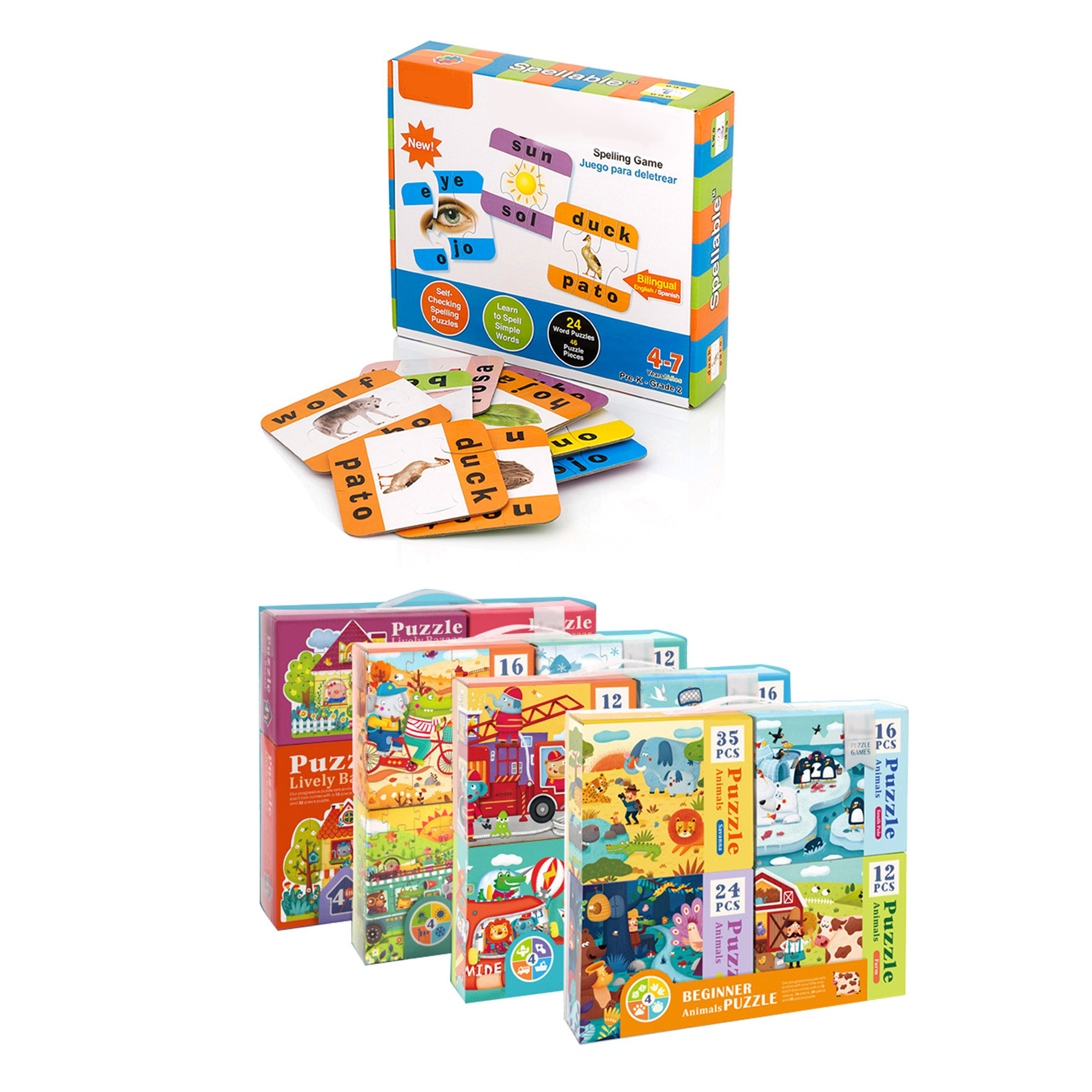 - 4-count animal puzzle set: 12, 16, 24, 35 pieces for progressive difficulty.