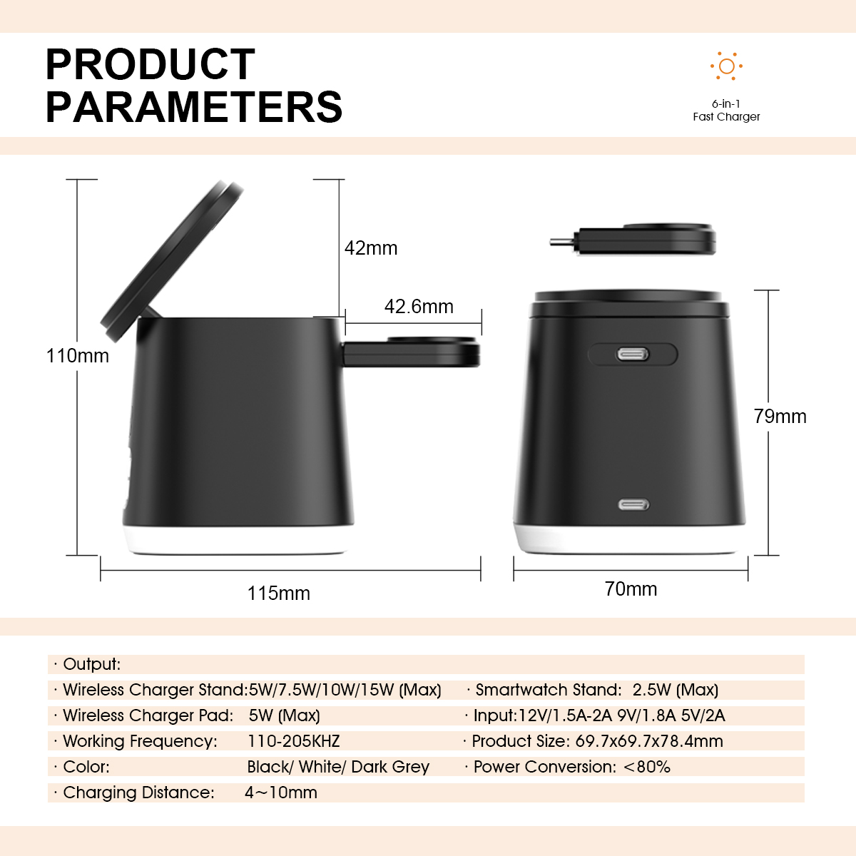 (1).6 in 1 wireless charger Stand-able folding place enables saving space.