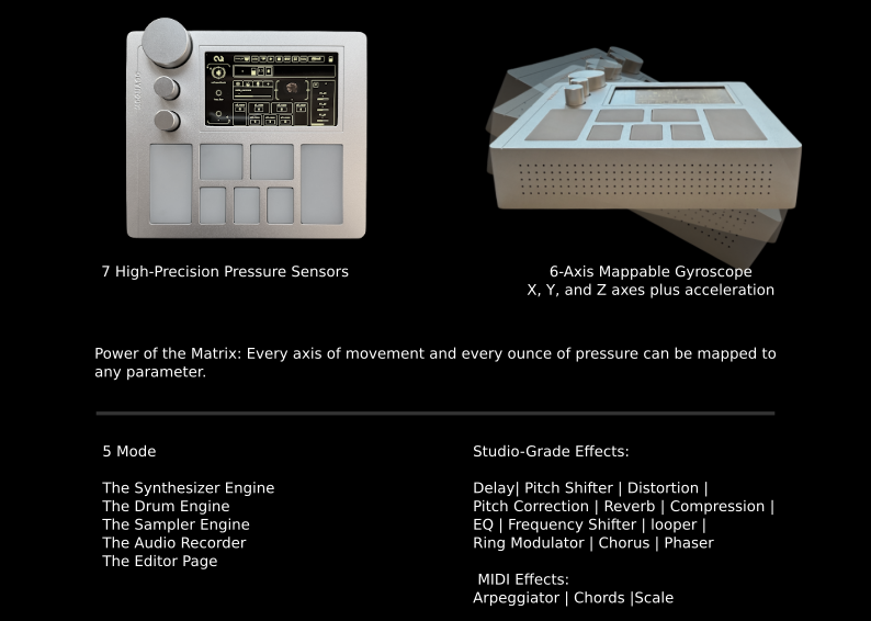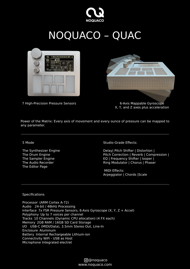 QUAC is a small, compact and sturdy synthesizer, sampler, sequencer and editor, an all-in-one solution. Also has multiple pressure and movement sensors that can be programmed in a custom way to control any of the sound making functions. It will break barriers and allow people to make elaborate songs in a playful and innovative manner, on the go. It leverages the power of new ARM chips to achieve top processing capabilities for music making.