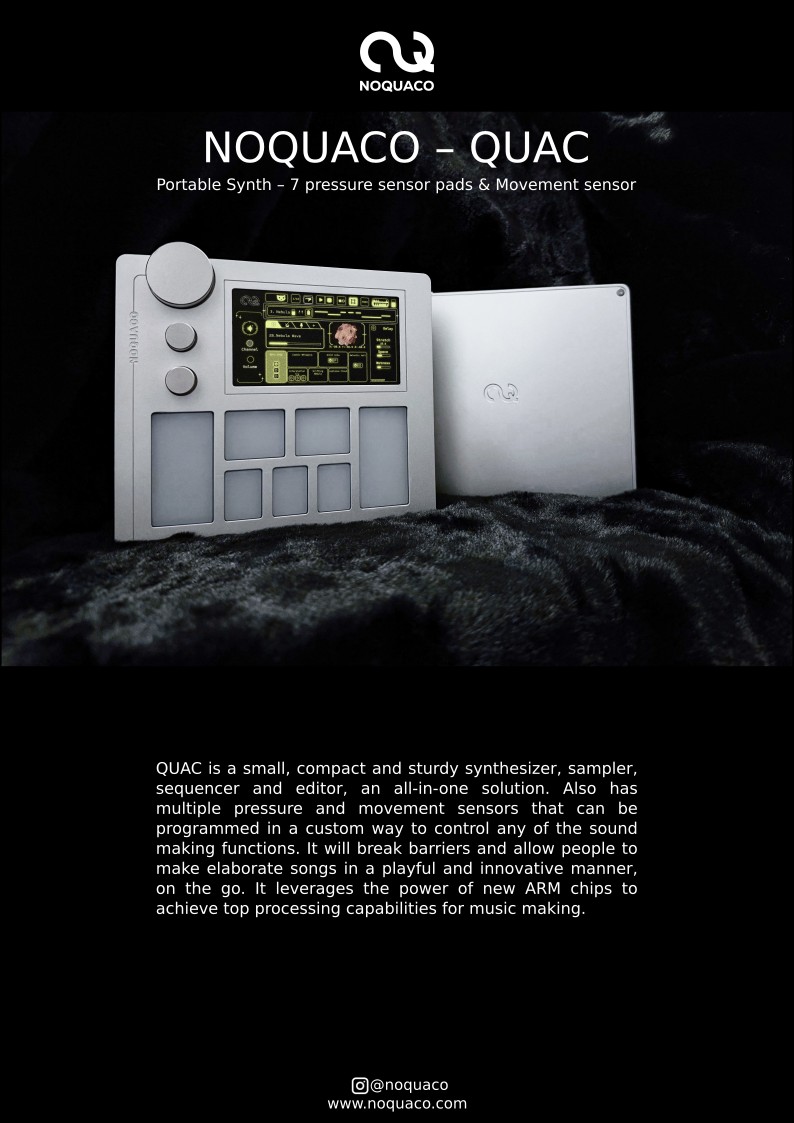 NOQUACO is an audio hardware development company dedicated to researching new interfaces for musical expression and bringing creativity in sound to a broad audience. We believe that sound technology has always shaped the way musicians create from the early days of analogue synthesizers to the digital revolution, advances in sound‑making techniques have had a tremendous impact on the music industry. Our mission is to remove technical obstacles that hinder music enthusiasts from reaching new depths in creativity and exploration.