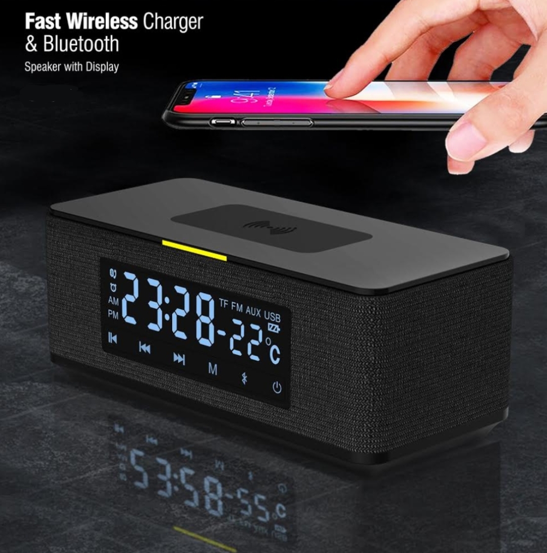 - Qi wireless charging (5W) alarm clock with Bluetooth speaker.