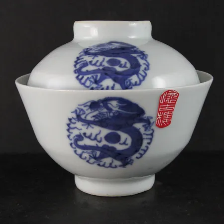 Qing Dynasty, Jiaqing Period Blue and White Covered Bowl with Dragon Design