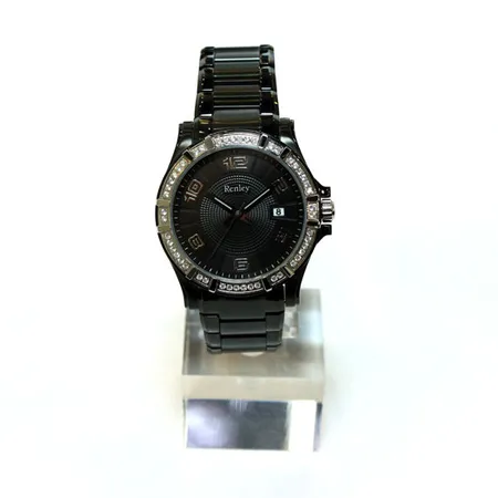 Available is a quartz analog watch tailor-made for men. Its casing is encircled and accentuated with glittery diamonds. With a solid black layout, this timepiece also lines your wrist with coolness.