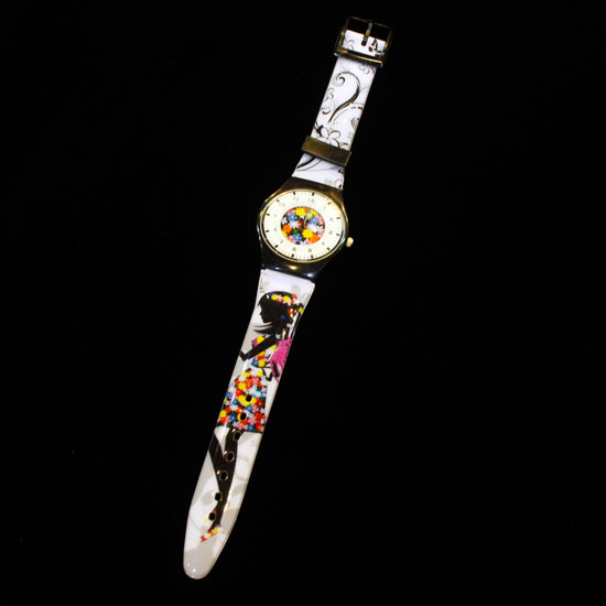 This watch comes with a feminine design in black and white. Floral patterns decorate the watch strap as well as the watch dial. Lovely graphics portraying a girl look playful and stylish.