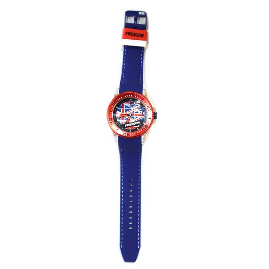 This quartz analog comes with a unique and fashionable design. It features a round case in bright red with an indented side and marks on the bezel. The dial is printed with British flag patterns for added distinctiveness.