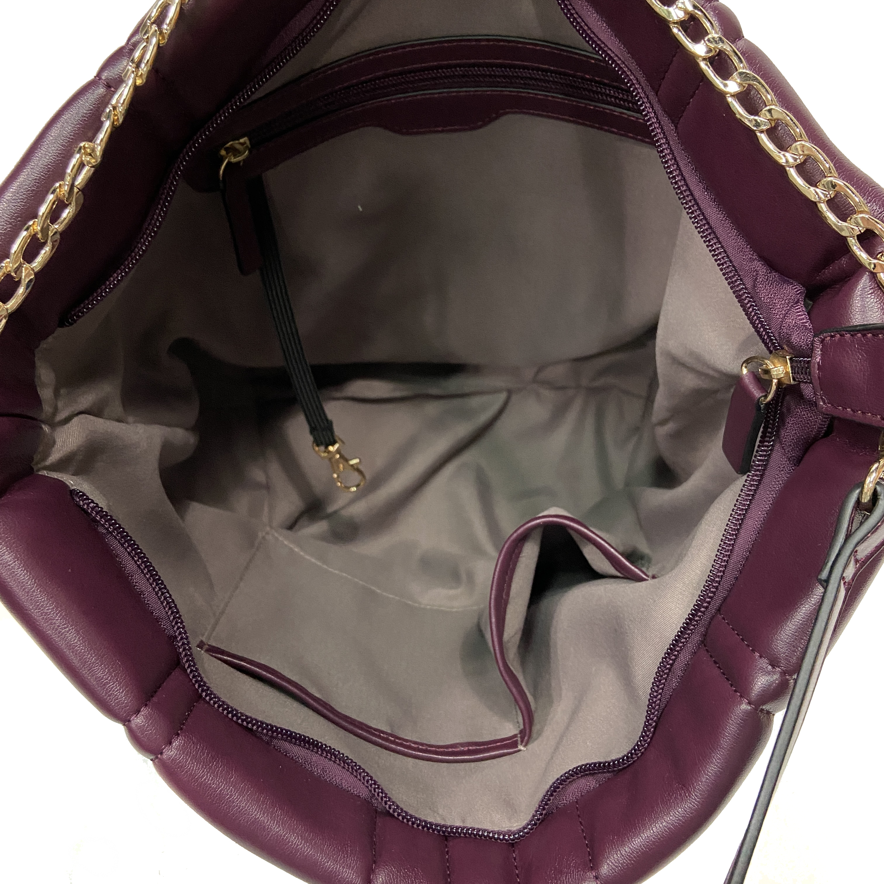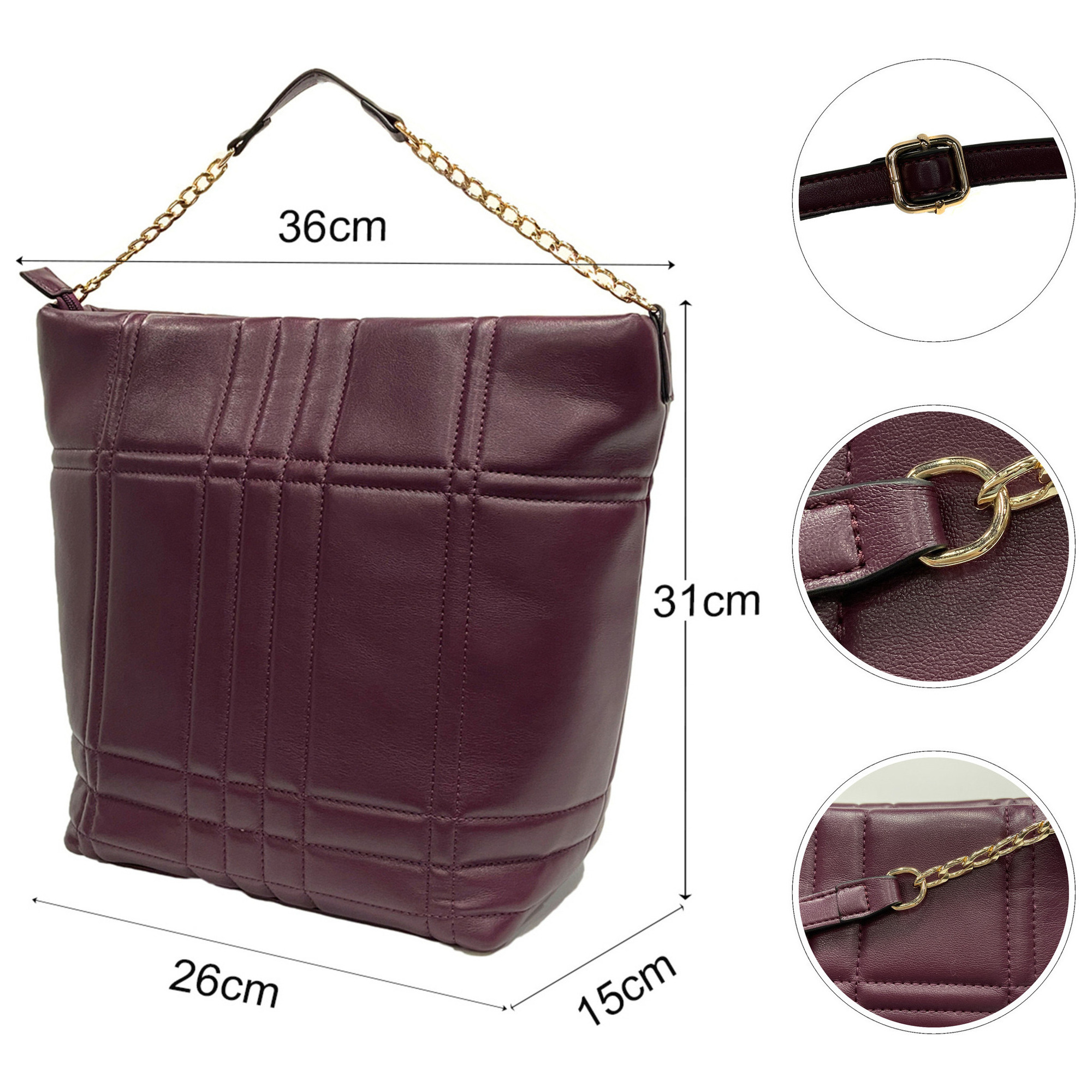 • Metal chain strap, Detachable and adjustable shoulder strap, 1 Interior zip pocket & 2 Interior slip pockets