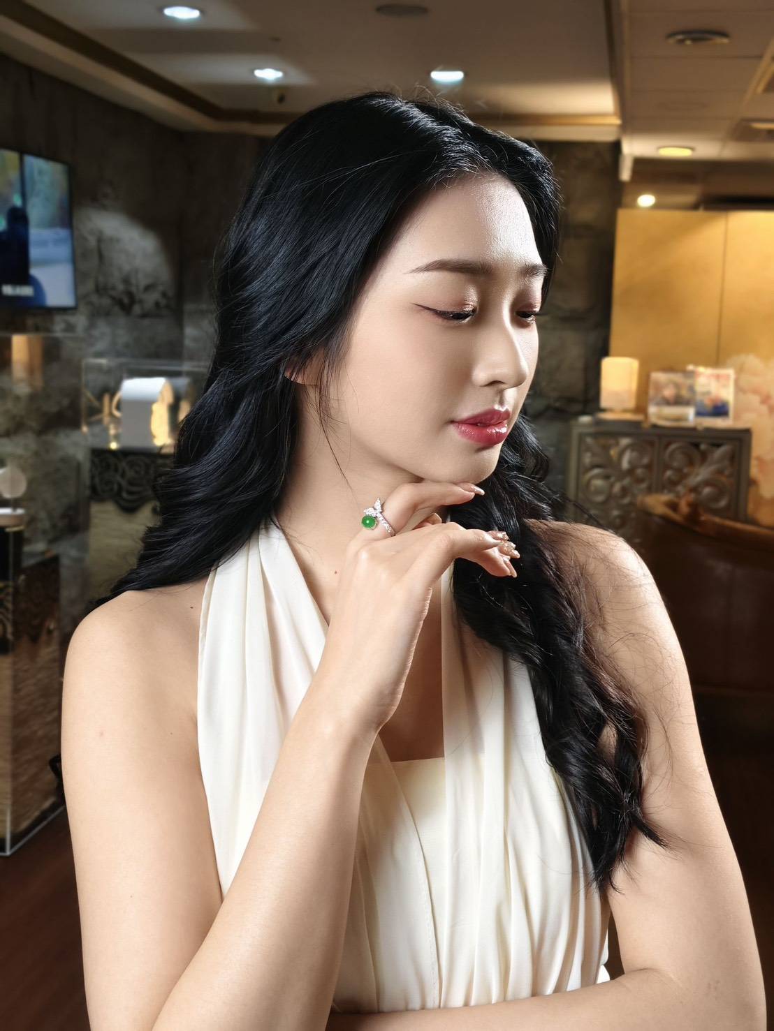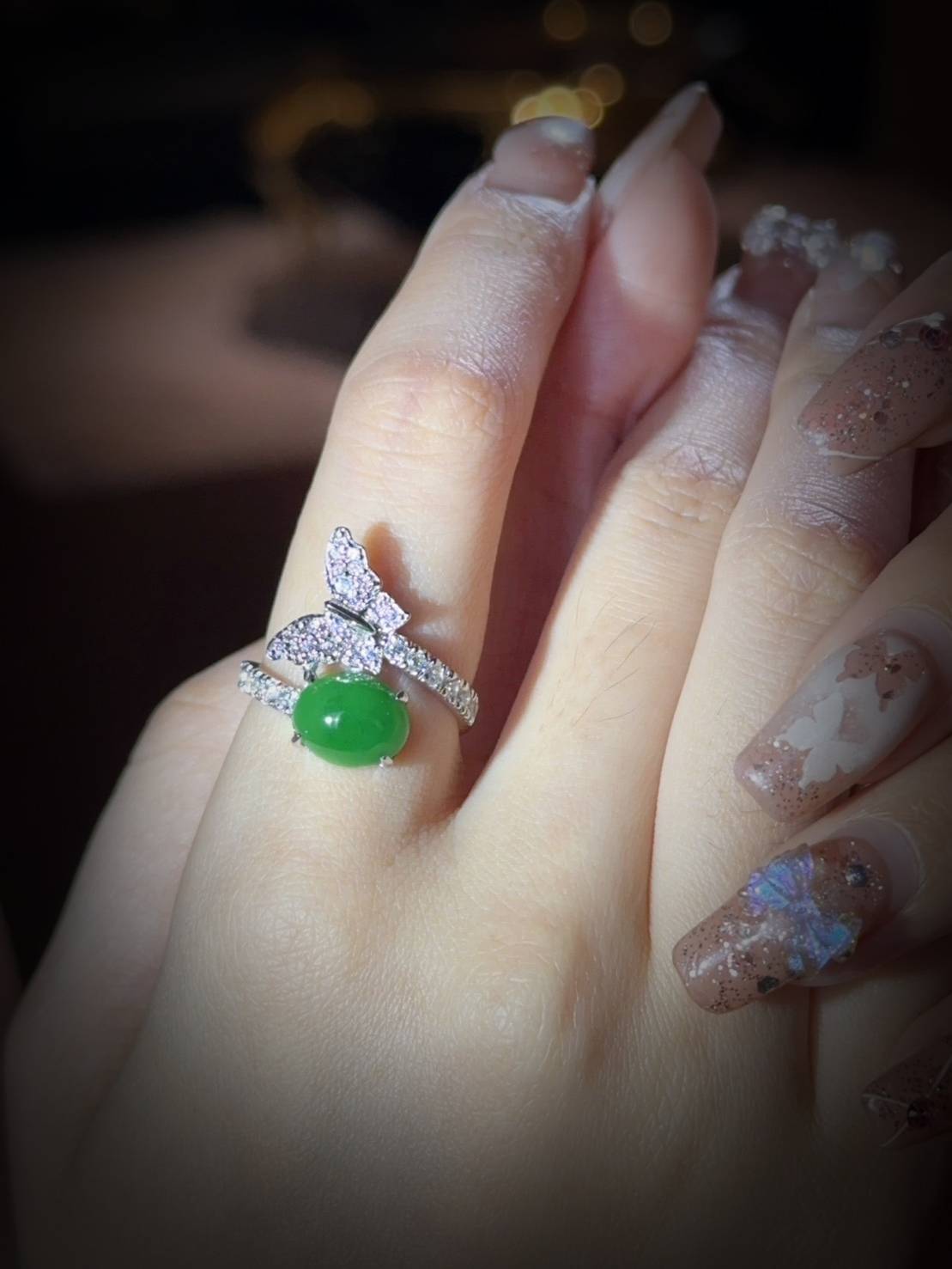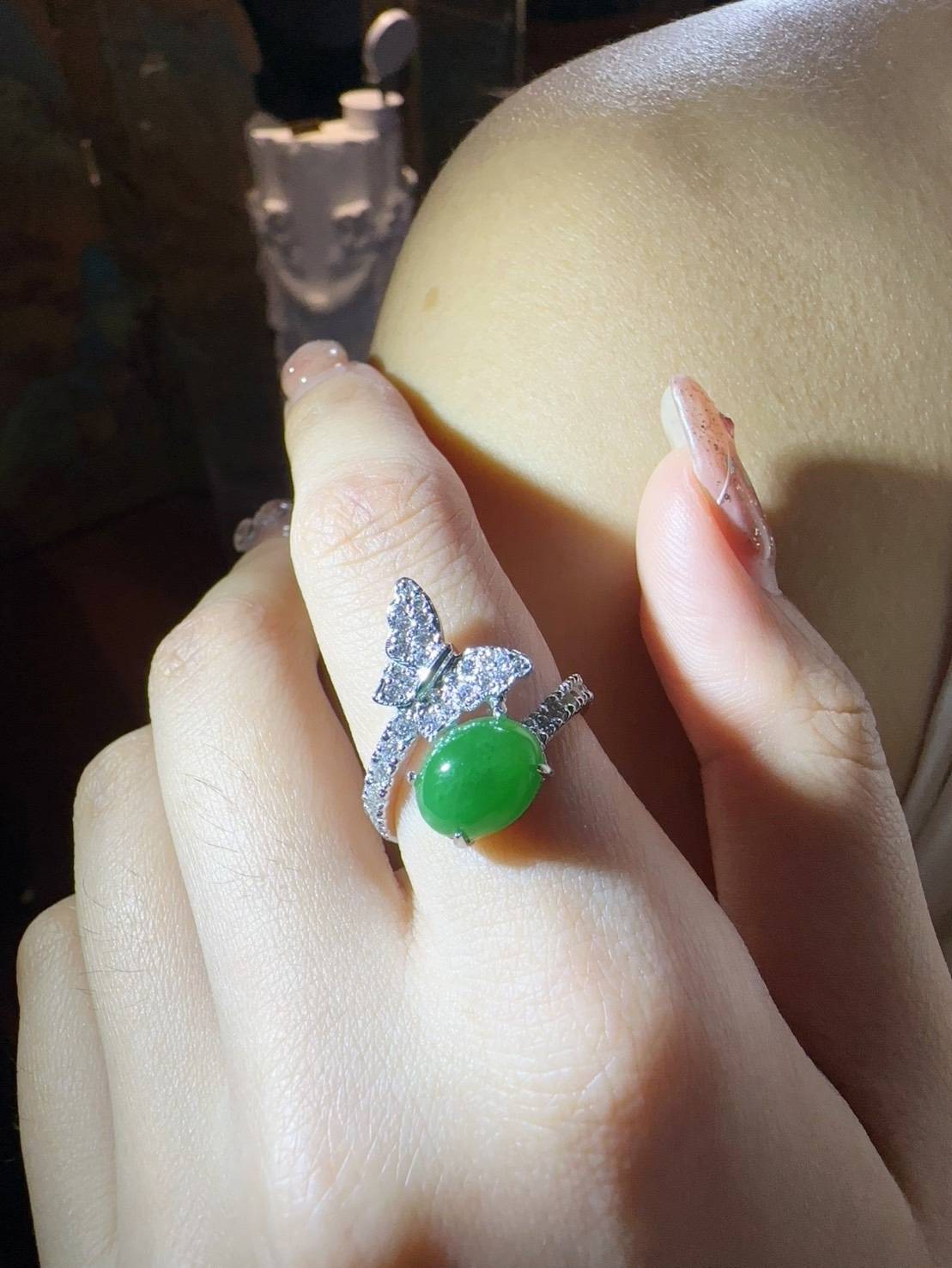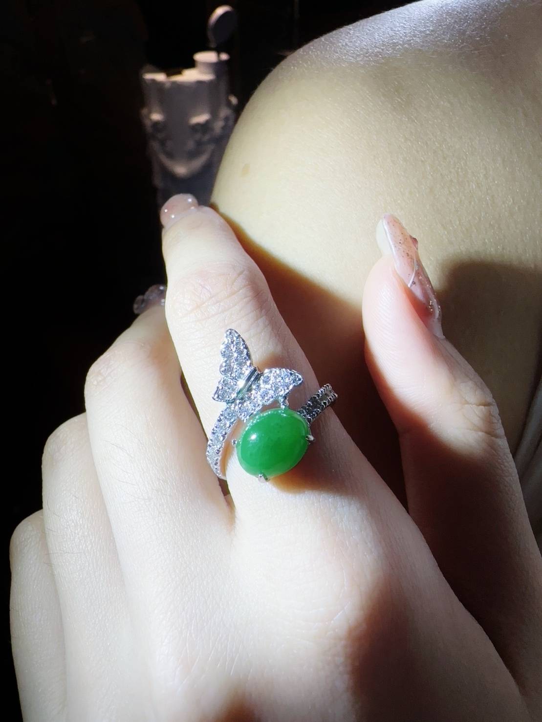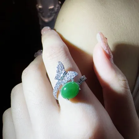這枚戒指中央鑲嵌著一顆色澤濃郁、光潤飽滿的橢圓形翡翠蛋面。其優雅的翠綠色澤與周圍的鑲嵌形成完美對比。戒指頂部設計為一隻展翅的鑽石蝴蝶,密鑲的鑽石閃爍著璀璨光芒,彷彿蝴蝶停駐在玉石之上。這件作品融合了大自然的靈動與精緻珠寶工藝,極具生命力與女性魅力。