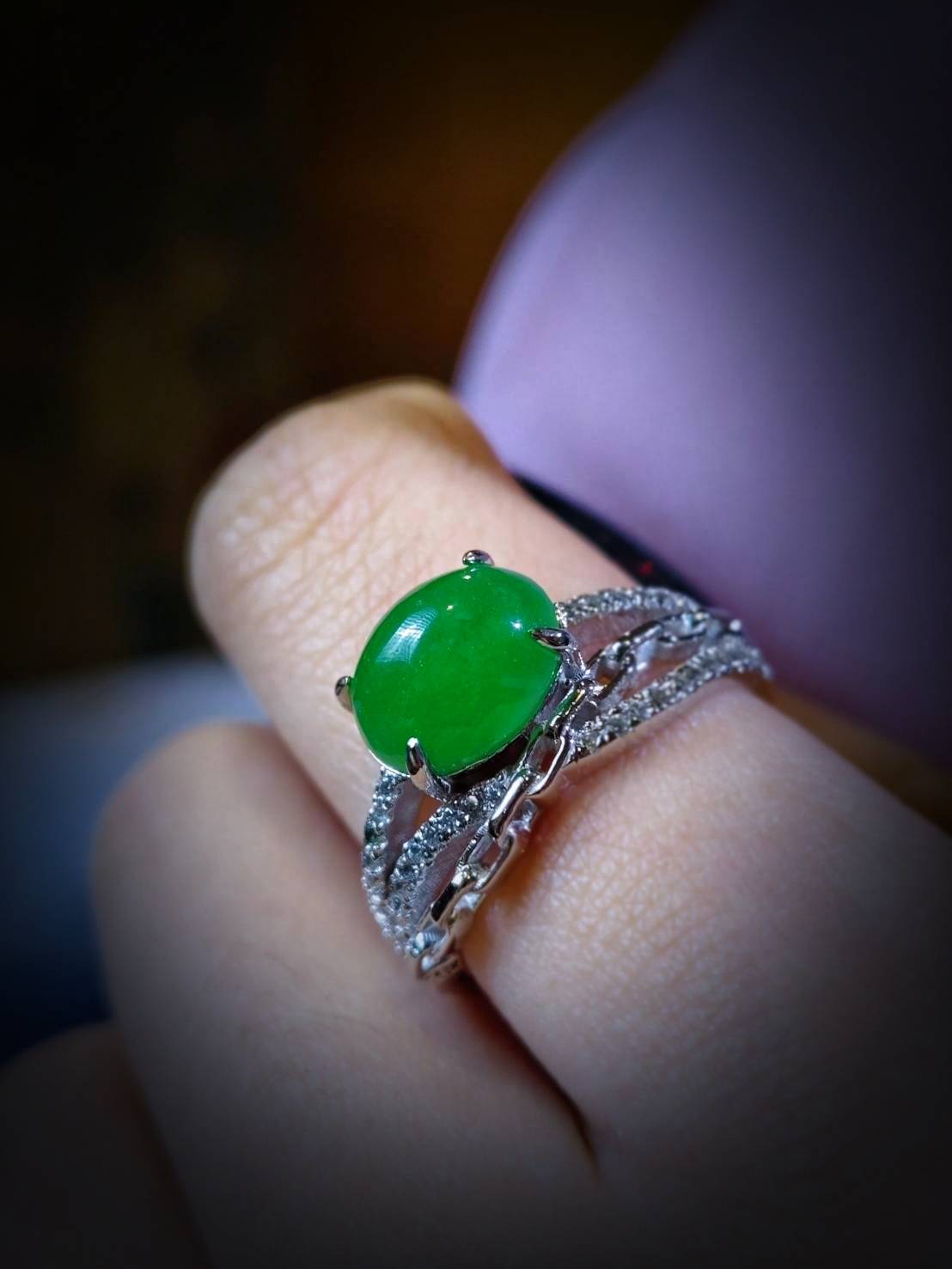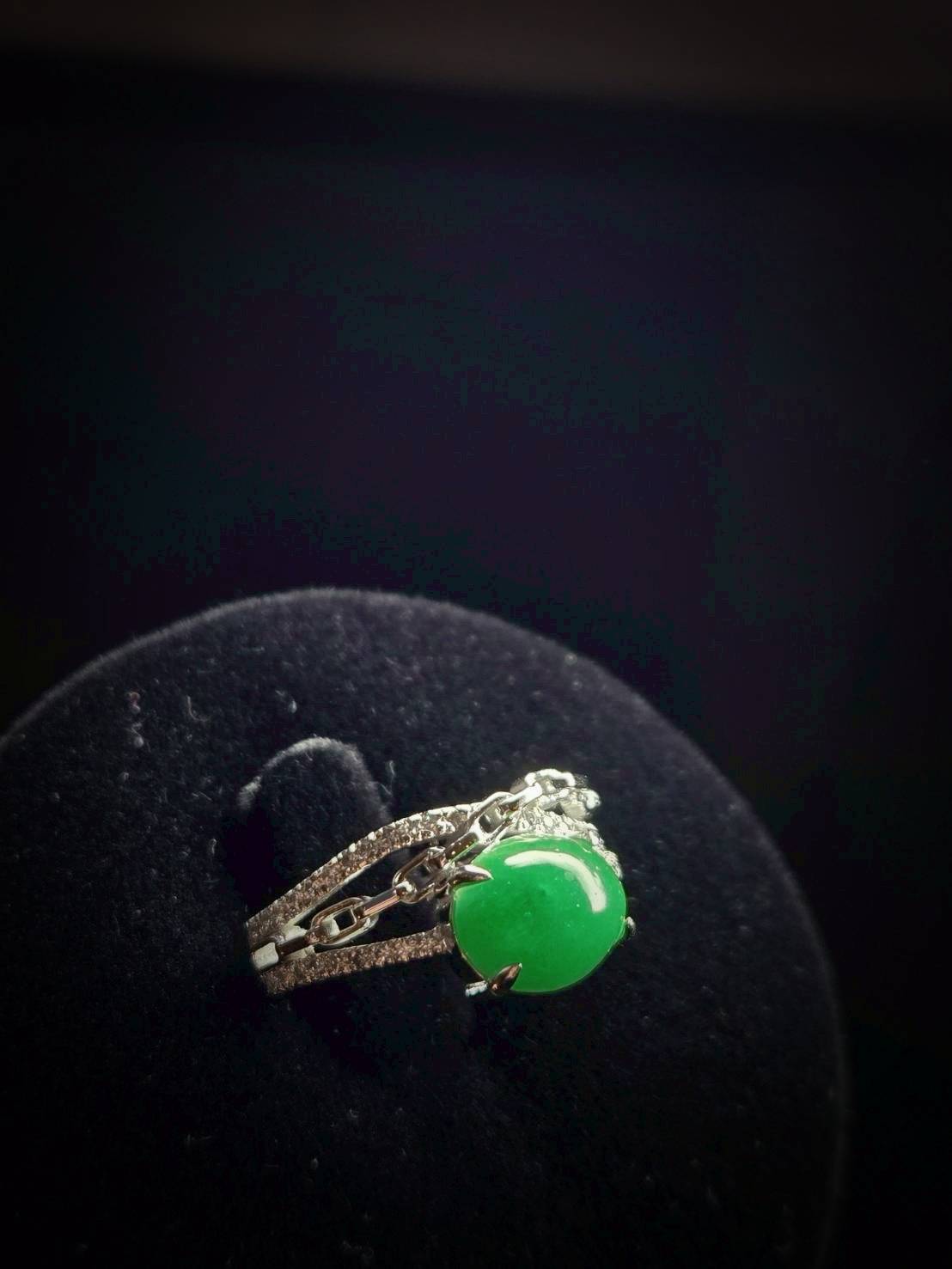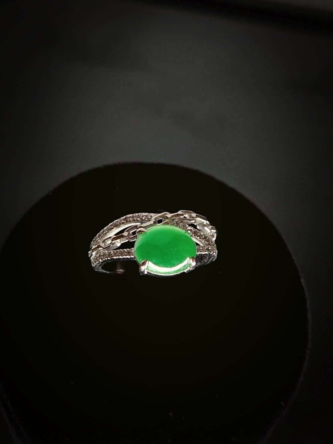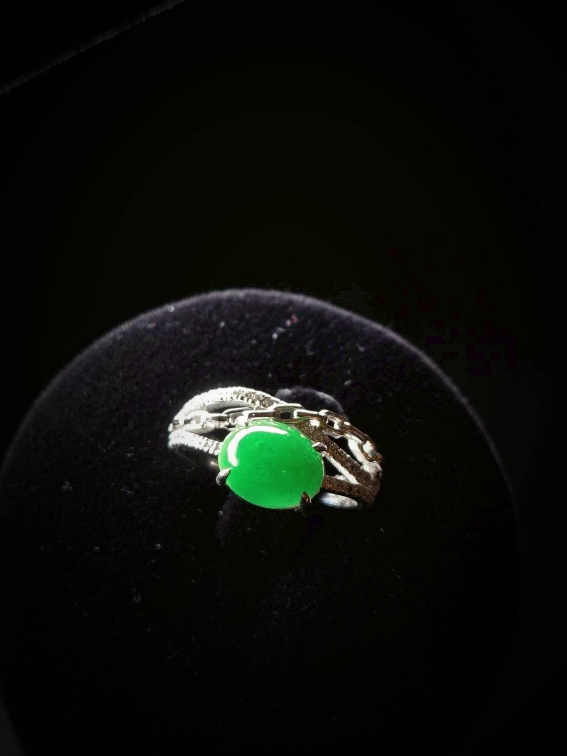 翡翠戒指完美詮釋了極致奢華。主石擁有一眼難忘的帝王綠,色澤濃郁且深邃,散發著無可比擬的高貴氣息。經典的蛋面切割圓潤飽滿,質地如凝脂般細膩,透光時流轉的靈動寶光更是展現出頂級翡翠的生命力。