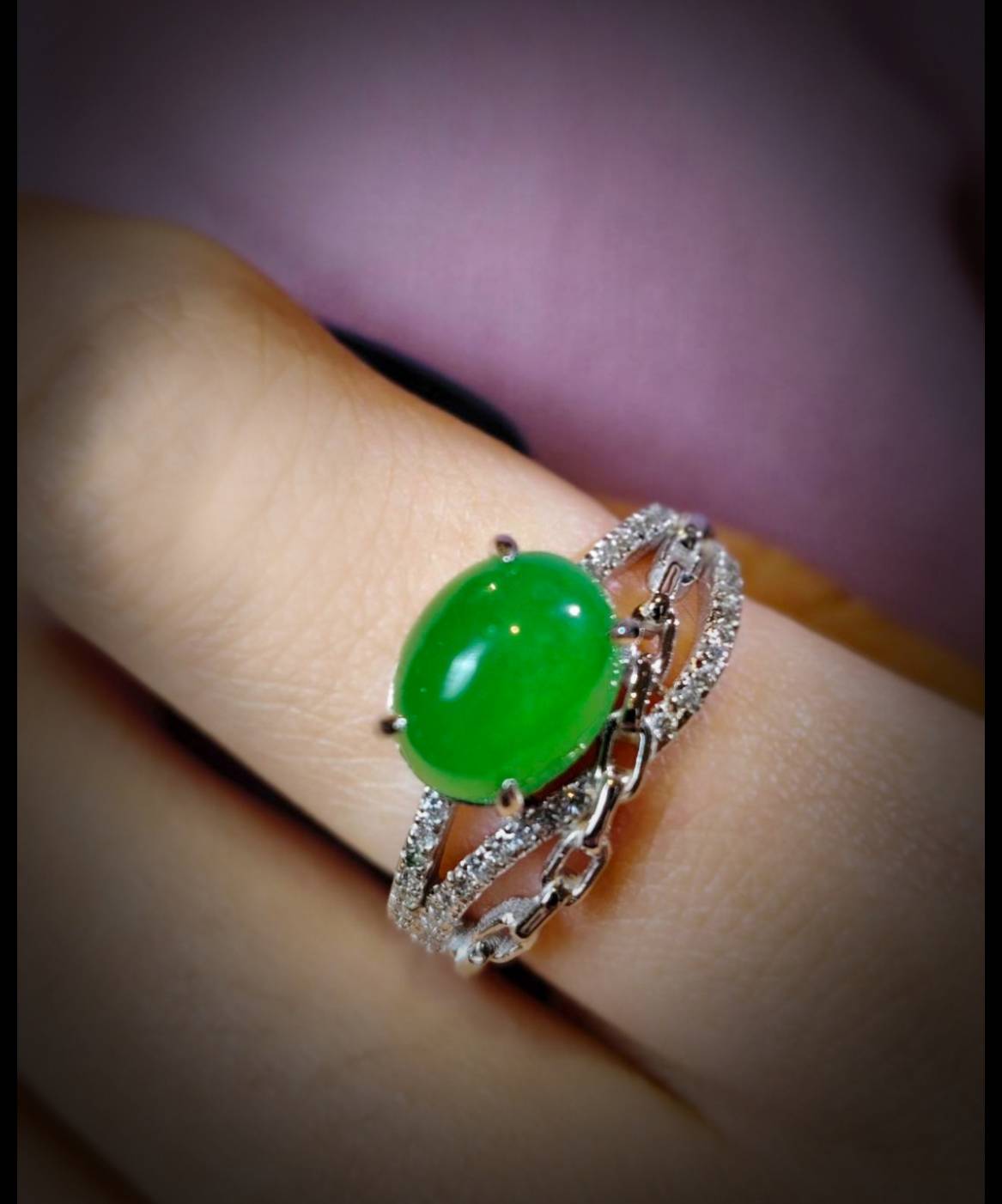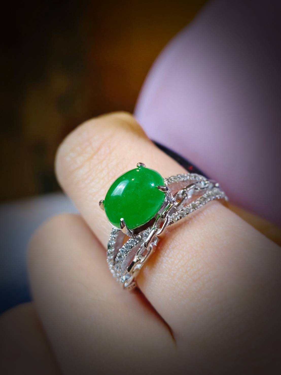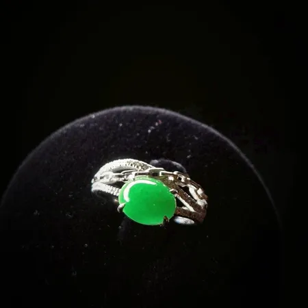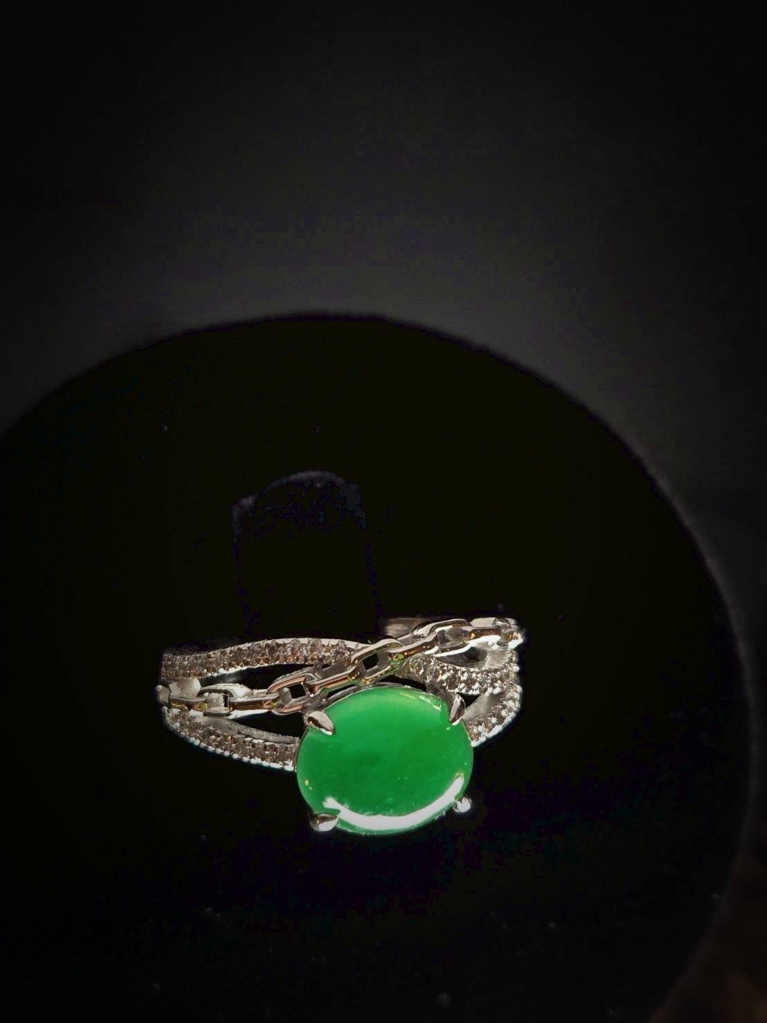 翡翠戒指完美詮釋了極致奢華。主石擁有一眼難忘的帝王綠,色澤濃郁且深邃,散發著無可比擬的高貴氣息。經典的蛋面切割圓潤飽滿,質地如凝脂般細膩,透光時流轉的靈動寶光更是展現出頂級翡翠的生命力。