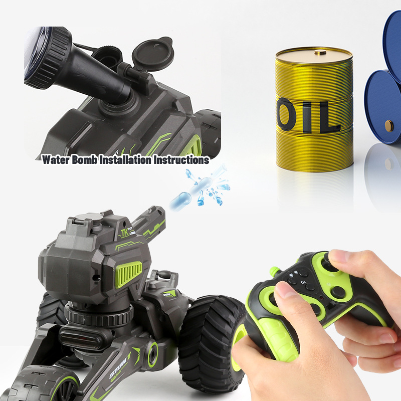 Functions: goes forward/backward, turn left/right, one key deformation, the car with light & music, with one key shooting.