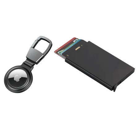 The Aluminum RFID wallet + Key chain/Case w/ Airtag holder kit. comes with a strong RFID blocking System that blocks all sorts of digital theft attempts and keep your credit cards safe! Keychain is made of high quality metal, with easy-access hook design you can easily attach your AirTags to items, such as keys, bags, wallet ,suitcase and dog collars, and it's convenient to clip on and go. Magnetic desing. (AIRTAG NOT INCLDUED)