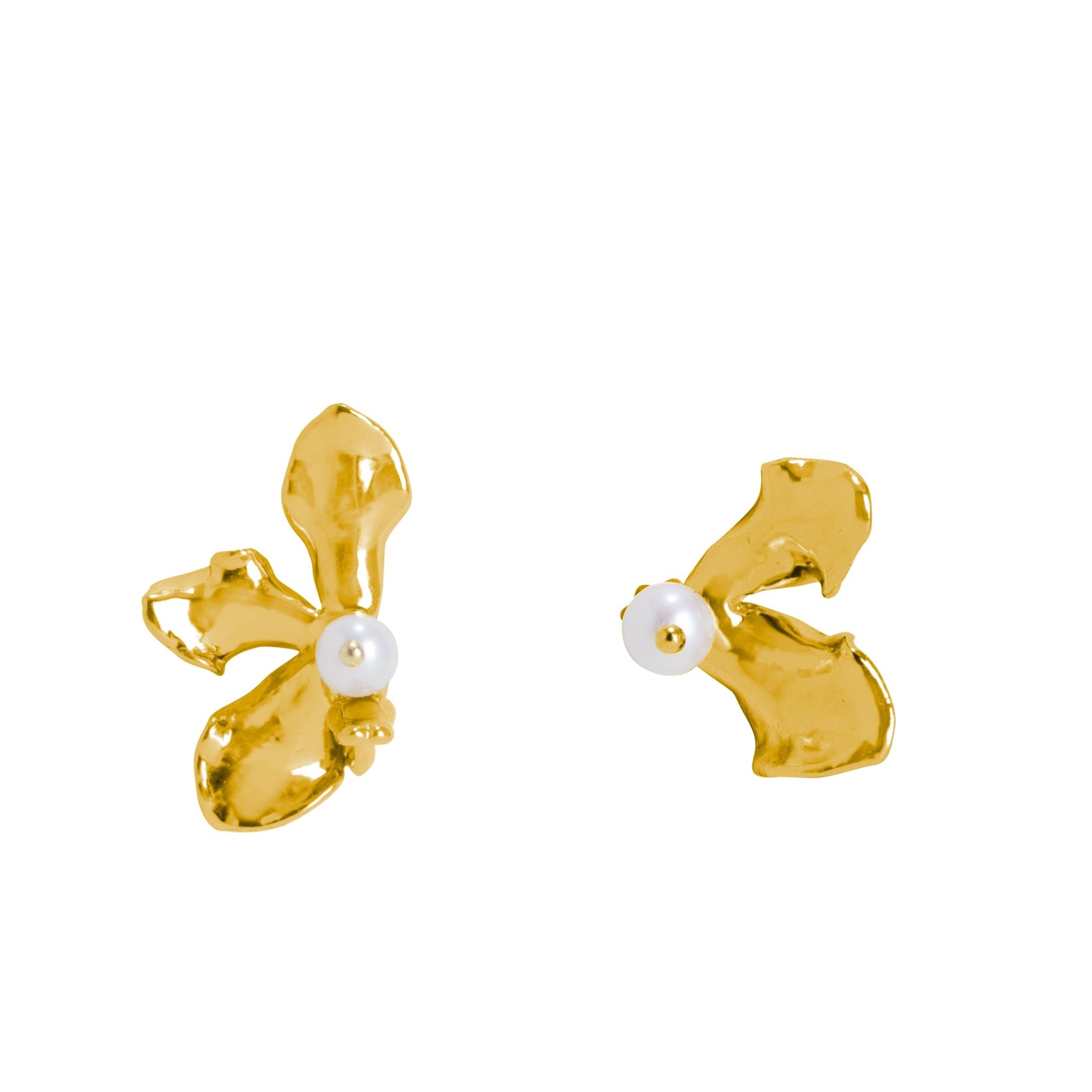 Whispering asymmetry, this pair of earrings is creatively handcrafted to represent an evolution of a classic style. The natural Vanda Limbata Orchid is encapsulated in 24K Swiss Gold and adorned with lustrous Freshwater Pearls. This unique design includes a detachable pearl stud, allowing for two distinct looks and added versatility.