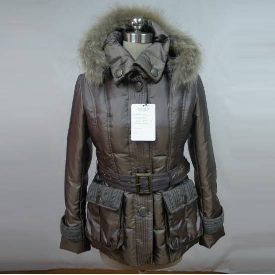 The rivet down jacket boasts a raccoon hood to protect the wearer from strong wind. It comes with two flap-closure front pockets and a waist belt to let you stay warm in style. It is an ideal women's outerwear in winter that looks great with jeans and casual clothing.