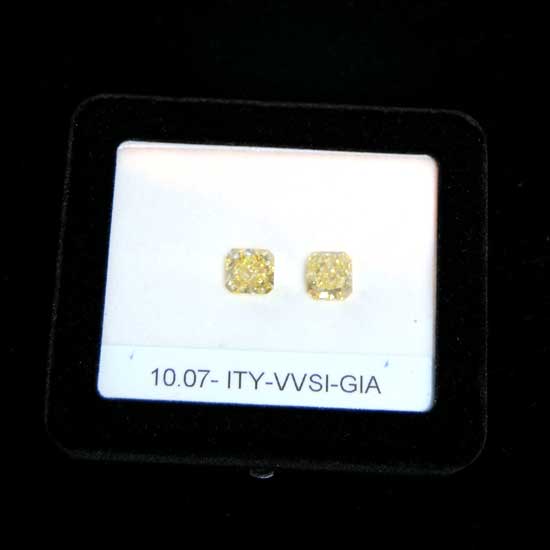 Featured is a pair of yellow-colored diamonds in a radiant-cut design. The diamonds reflect infinite beauty with its exceptional brilliance and fire. They will add charm and sparkle to any jewelry design.