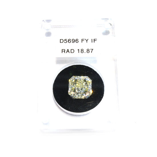 Featured here is a magnificent radiant cut fancy diamond of a yellowish color. This gorgeous stone boasts perfect clarity and weighs over 18 carats. Impressive and finely crafted, this rare jewel is an exquisite choice for fine jewelry application.