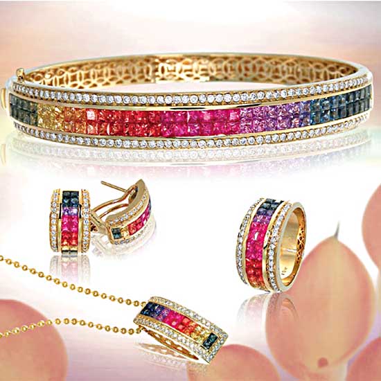 This beautiful rainbow jewelry set includes a bracelet, a ring, a necklace with a pendant and a pair of earrings. They are embellished by rainbow-color stones with glittering loose diamonds set around the edges of the jewelry. With a gold base, the jewelry sparkles under light, making it eye-catching. To make you shine in the party, you should get this gorgeous set of jewelry.