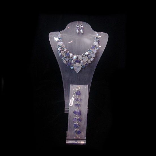 This is a jewelry set beautifully carved from sterling silver and rainbow moon stones. It consists of a bracelet, a pair of earring and a necklace. The simple design and delicate size easily match with your elegant outfit.