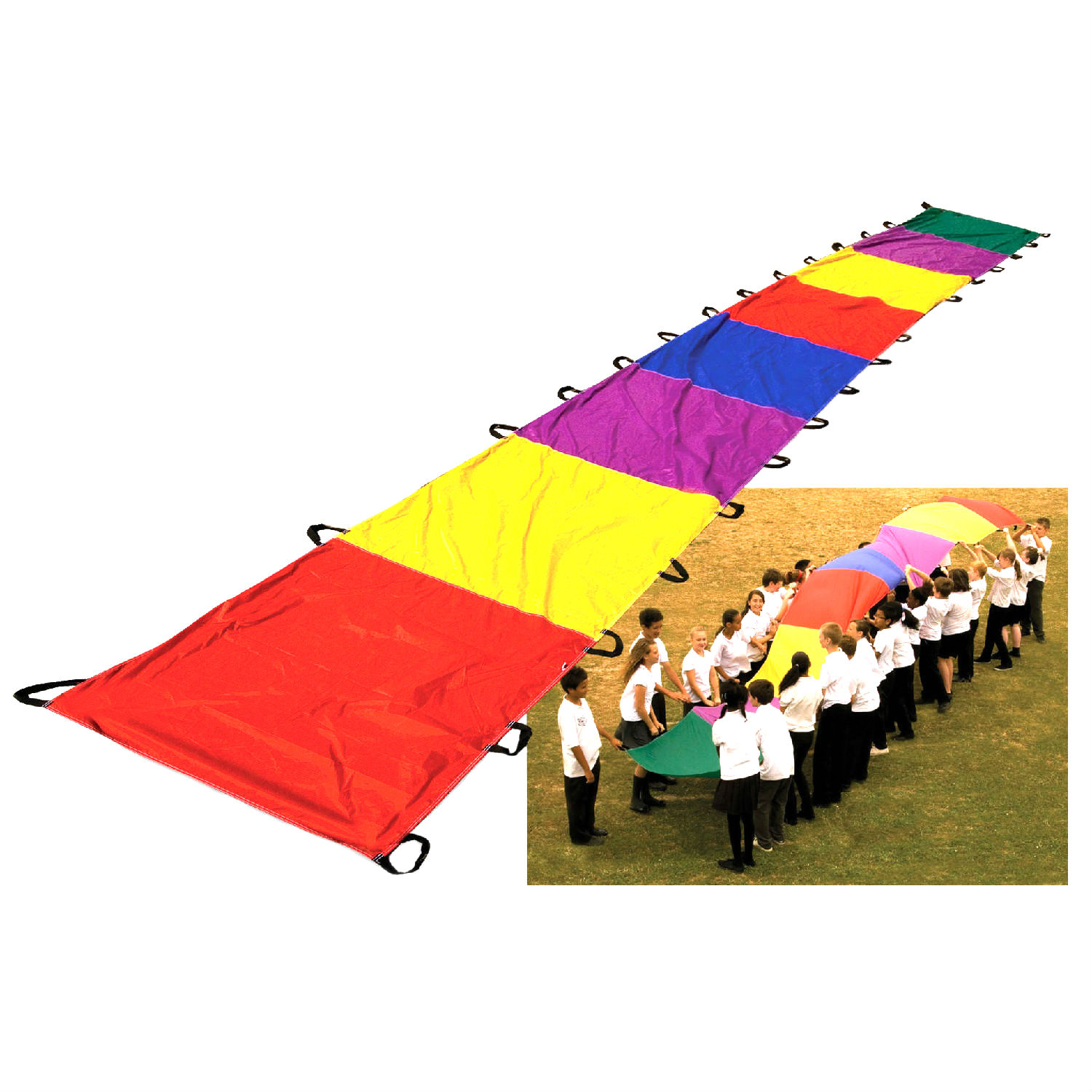 This brightly coloured wave is ideal for group participation for up to 30 children of all ages and abilities. Use for developing social and team work skills, colour identification, estimation and probability. The rainbow wave encourages physical exercise for the whole body and is a highly effective way of developing coordination and balance. Children can use their imagination to create a variety of different games, for example, moving a ball or bean bags from one end of the wave to the other. Can be used indoors or outdoors. Made from durable nylon. Size 8m x1m with 30 handles